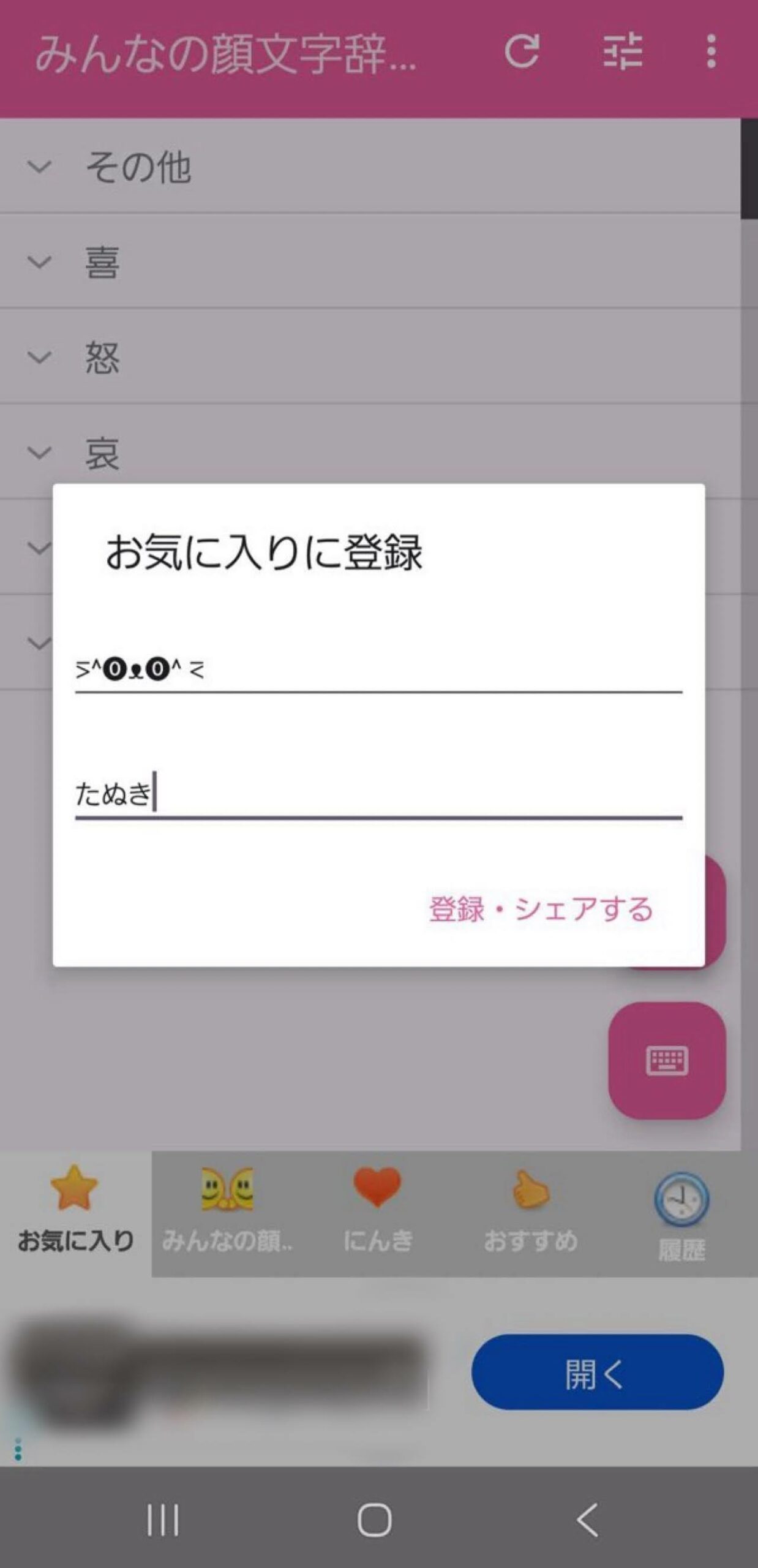 4. 登録する顔文字と読みを入力し、[登録・シェアする]を押します