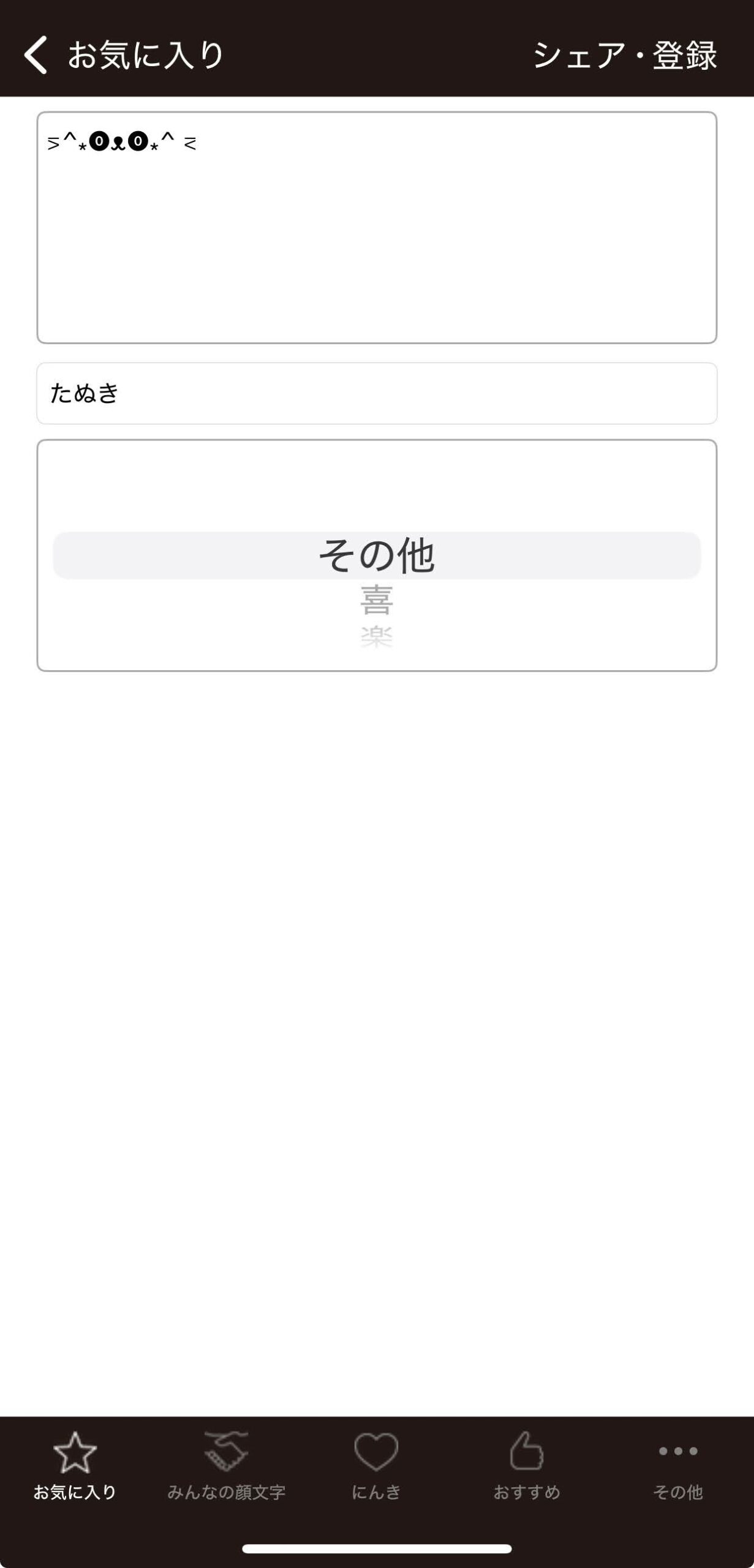 登録する顔文字と読みを入力し、カテゴリを選択して、右上の[登録・シェア]ボタンを押します