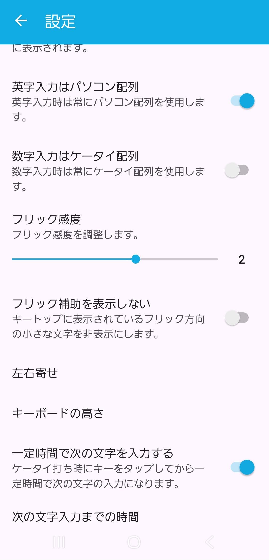 英字入力だけパソコンの並びにする flickではケータイ方式でかなを打ち、英字入力だけPC方式にする事ができます。 ホーム画面から[flick]を開き、[設定]をタッチします [ソフトウェアキーボードの詳細設定]をタッチします [英字入力はパソコン配列]をオンにします