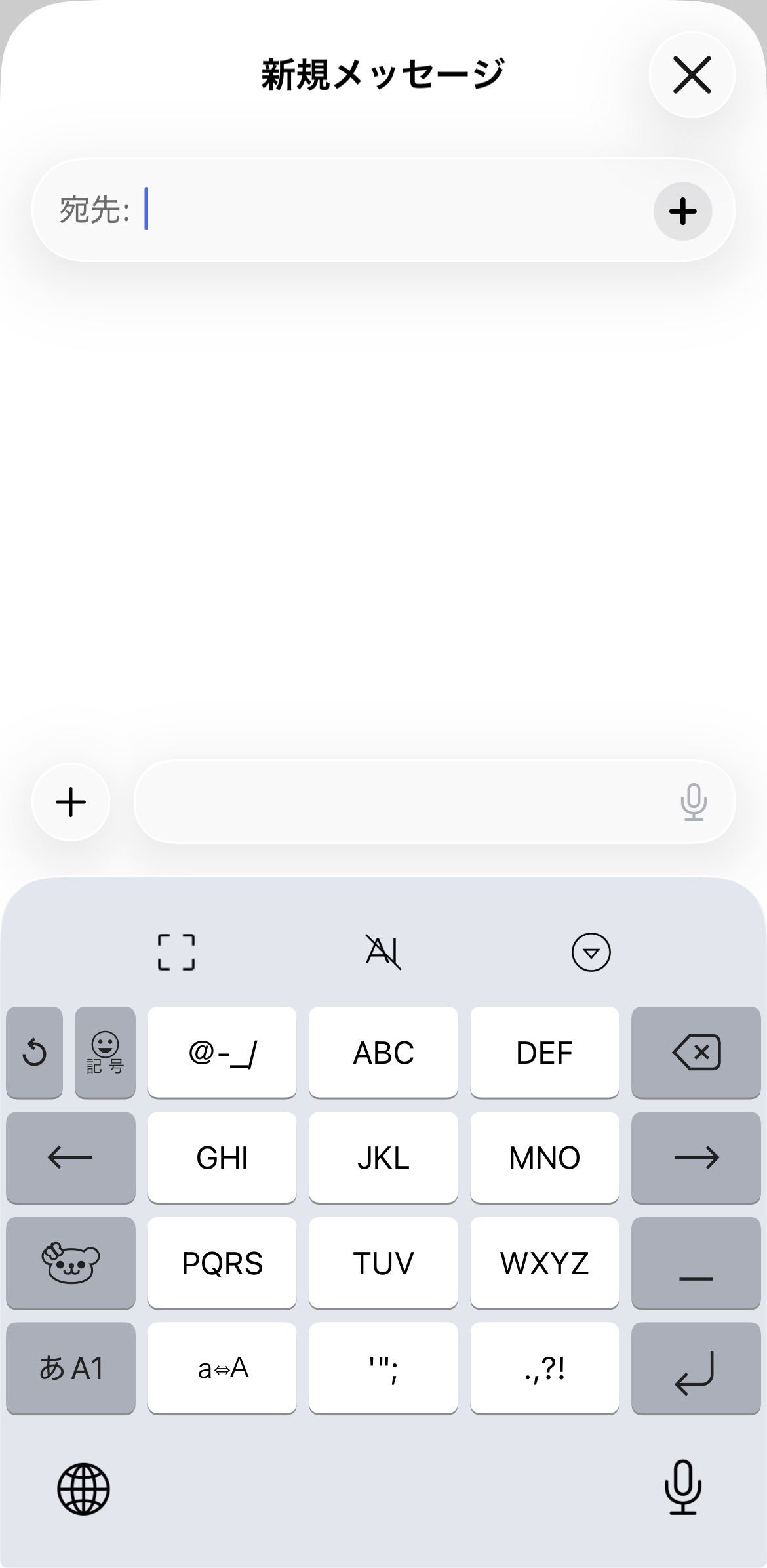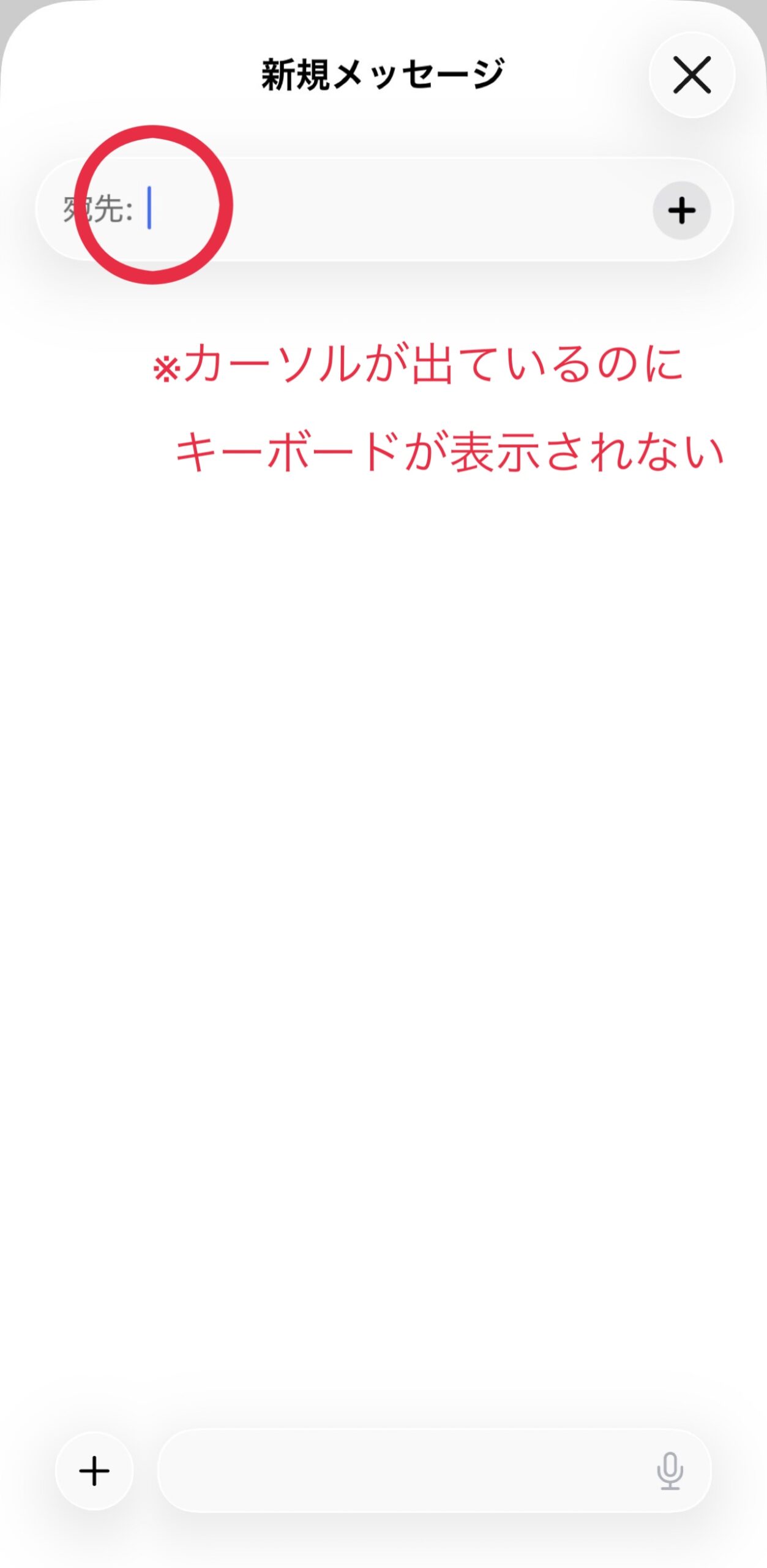 キーボードが表示されない 下のように文字入力を始めようとしてキーボードが表示されない事があります。 まず、他のアプリで文字入力しキーボードを表示させます 元のアプリに戻り文字入力するとキーボードが表示されます この不具合はApple社に既に報告しております。